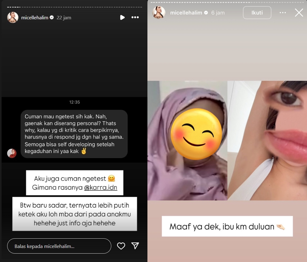 Dalam unggahan di Instagram Story, Michelle mengunggah foto seorang anak yang diduga merupakan anak dari warganet yang mengkritiknya.