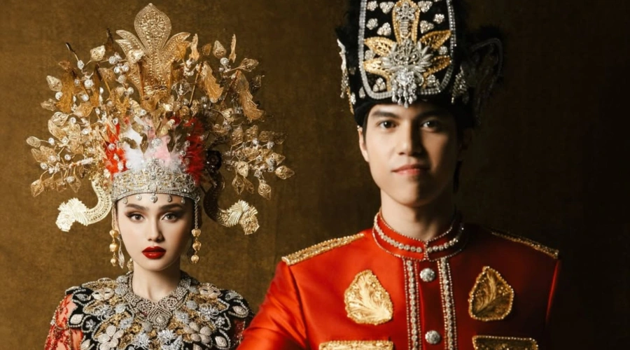 Syifa Hadju tampil sangat memukau dengan mahkota adat Bili'u yang megah, dipadukan dengan busana berpayet yang elegan. Sementara itu, El Rumi terlihat gagah bak bangsawan dengan setelan jas merah berornamen emas, lengkap dengan penutup kepala Makuta serta keris yang terselip di pinggangnya.