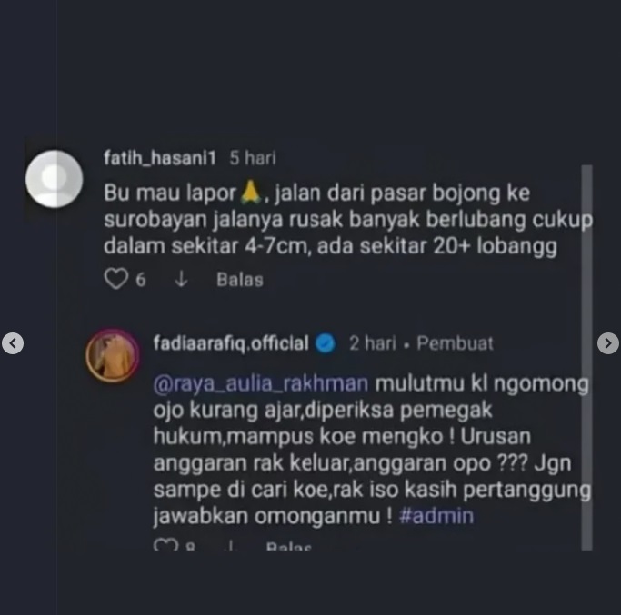 Anehnya, yang langsung ditanggapi justru komentar lain yang mempertanyakan soal anggaran. Dan di sinilah keahlian Fadia dalam ‘ngamuk online’ muncul. Bukannya menjawab dengan bijak, dia malah membalas dengan nada penuh emosi, bahkan mengancam akan melibatkan aparat penegak hukum.