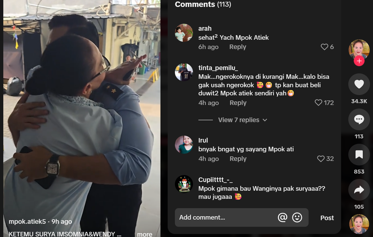 Saat memeluk Surya, tangan Mpok Atiek yang memegang rokok menjadi sorotan.