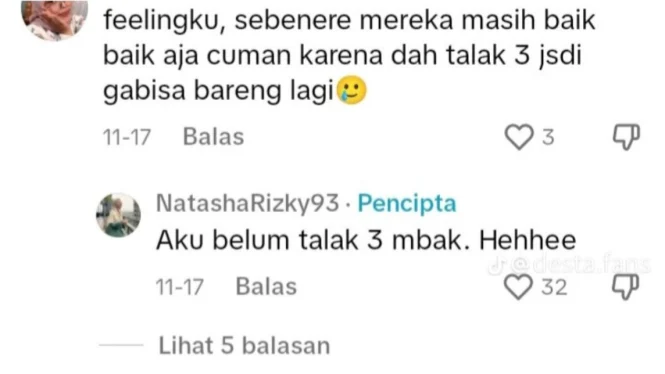 "Feelingku sebenernya mereka masih baik-baik saja. Cuma karena udah talak 3 jadi gabisa bareng lagi," ungkap salah seorang netizen.