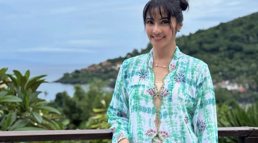 Ia tampil dalam foto-foto tersebut mengenakan atasan hijau tosca, dipadu dengan rok lilit bernuansa pastel pink dan hijau.