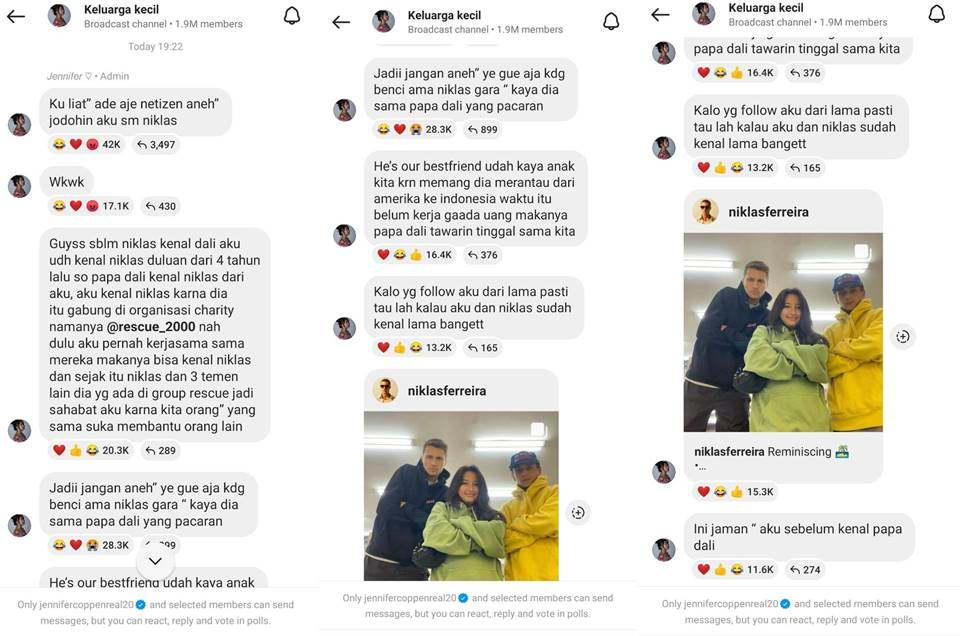 "Kulihat-lihat ada aja netizen aneh-aneh jodohin aku sama Niklas wkwk. Guys sebelum Niklas kenal Dali aku udah kenal Niklas duluan dari 4 tahun lalu so Papa Dali kenal Niklas dari aku," ungkap Jennifer Coppen di broadcast channel Instagram pada Kamis (1/8/2024).