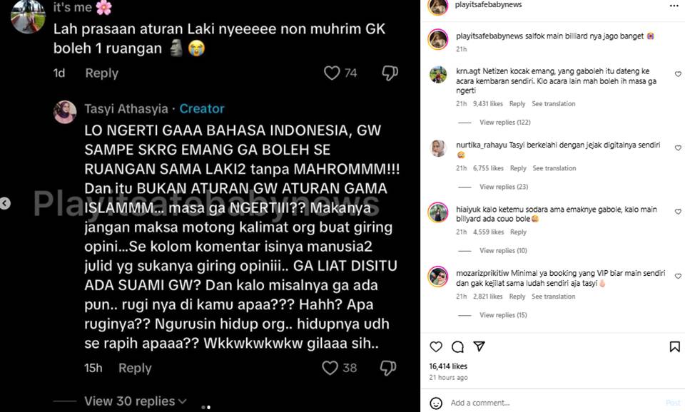 "LO NGERTI GAAA BAHASA INDONESIA, GW SAMPE SKRG EMANG GA BOLEH SE RUANGAN SAMA LAKI2 tanpa MAHROMMM!!!" tulis Tasyi.