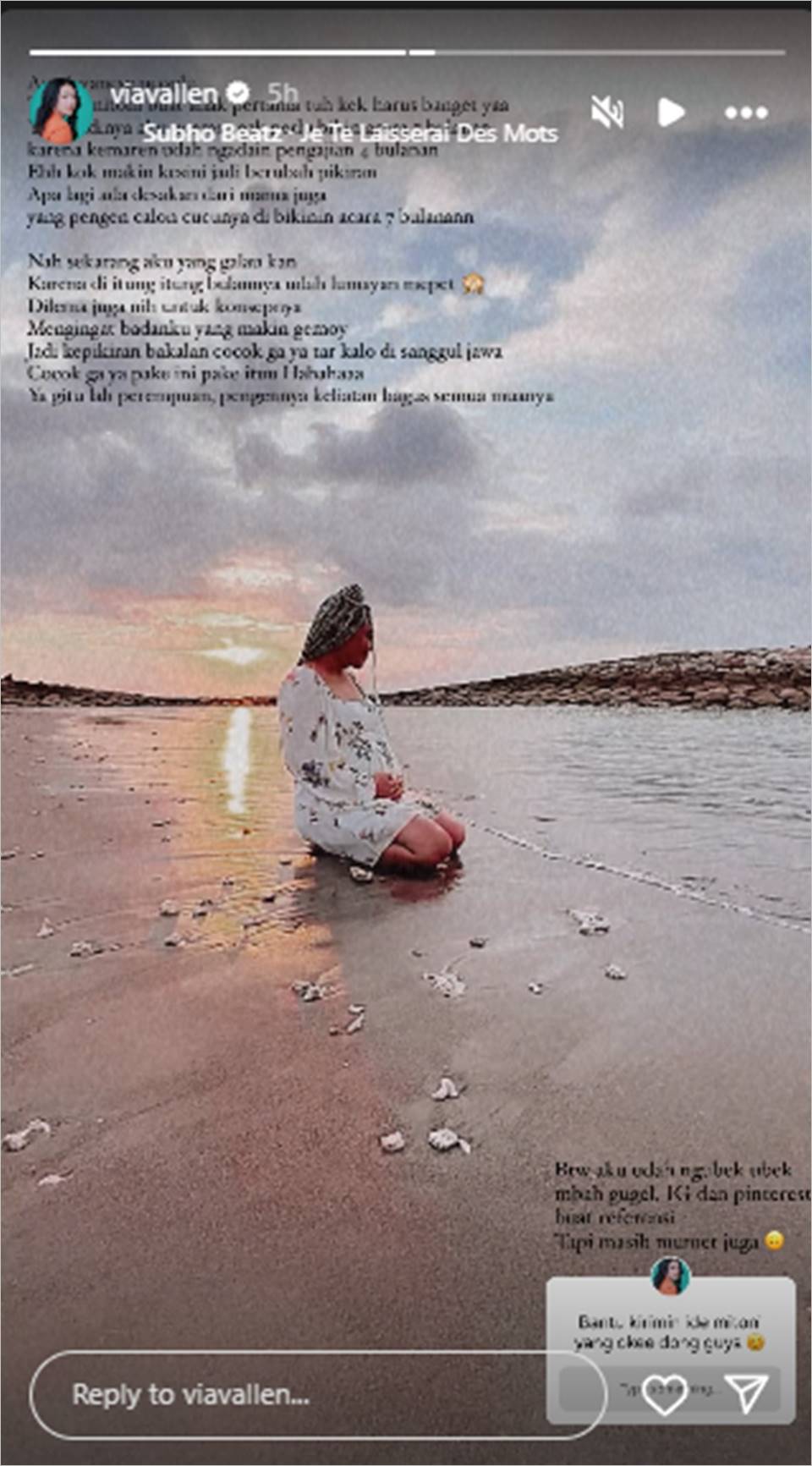 "Nah sekarang aku yang galau kan karena diitung-itung bulannya udah lumayan mepet. Dilema juga nih untuk konsepnya mengingat badanku yang makin gemoy," lanjut Via.