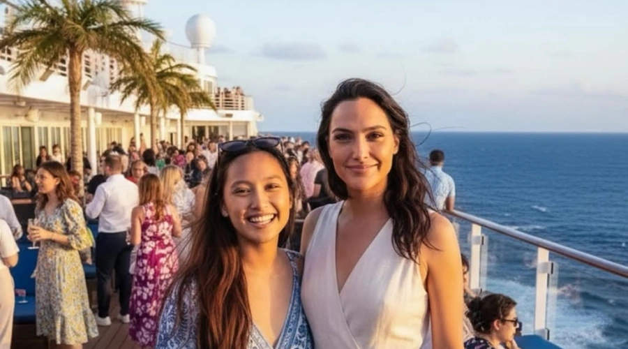 Kisah berlanjut ketika Kartika bertugas membersihkan area kolam renang dek atas saat pelayaran menuju Karibia. Di sanalah ia bertemu Gal Gadot yang disebut sedang duduk sendirian menikmati sunset.