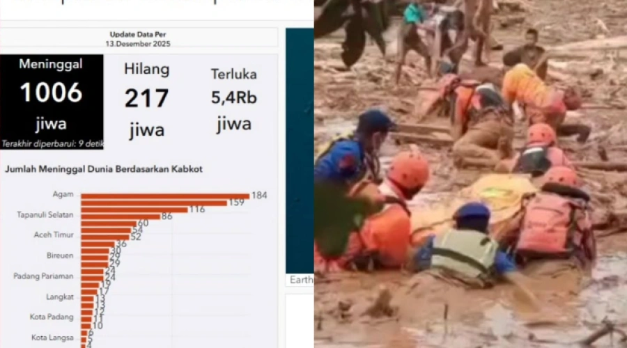 Melansir dari rekapitulasi terdampak bencana banjir bandang dan tanah longsor, per hari ini Sabtu, 13 Desember 2025 terdapat korban meninggal 1006 jiwa. Jumlah korban meninggal dunia tersebut didata berdasarkan Kabupaten/Kota dengan rincian sebagai berikut.