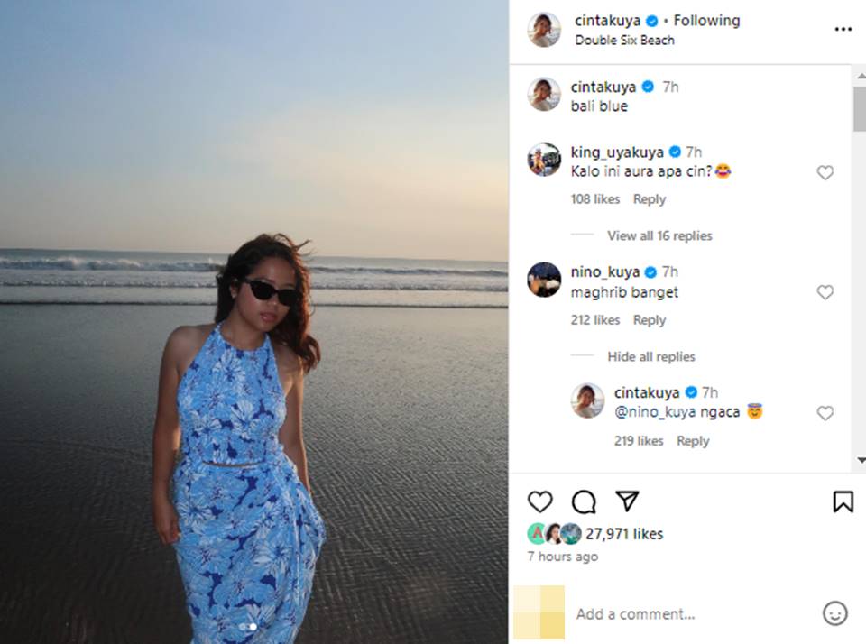 Cinta Kuya disebut punya aura Maghrib banget oleh adik kandungnya sendiri, Nino Kuya. Hal itu terlihat dalam kolom komentar postingan terbaru Cinta di Instagram.
