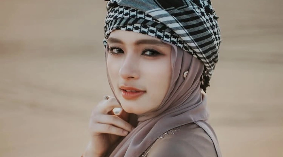 Untuk kerudungnya, Inara mengenakan kerudung warna coklat yang tidak terlalu besar, yang satu sisinya ia taruh di belakang pundak.