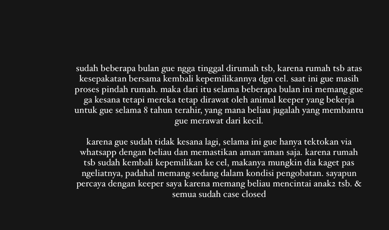 "Karena gue sudah tidak ke sana lagi, selama ini gue hanya tektokan via WA dengan beliau (animal keeper) dan memastikan aman-aman saja," tulis Okin seakan menyalahkan animal keeper atas kondisi Nala.