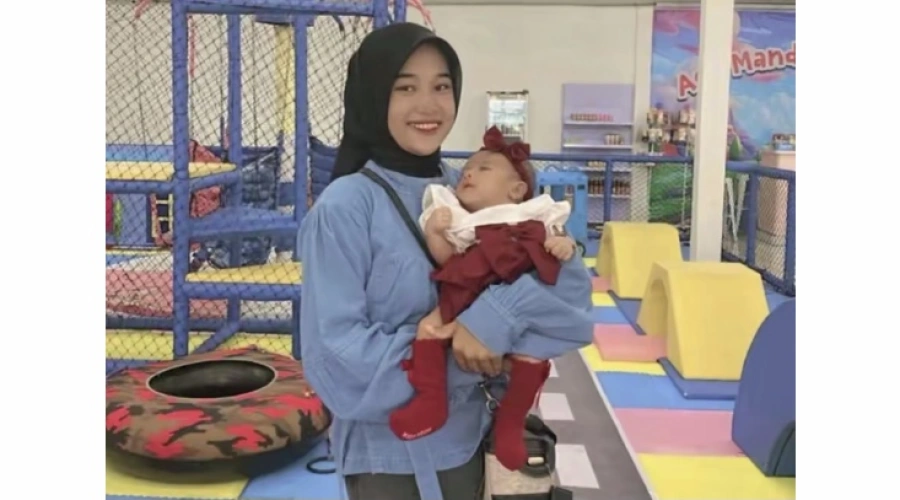 Dalam foto-foto yang dibagikan oleh sang ibu, bayi 1 bulan tersebut tampak ditempatkan dalam posisi duduk di tengah kolam bola.