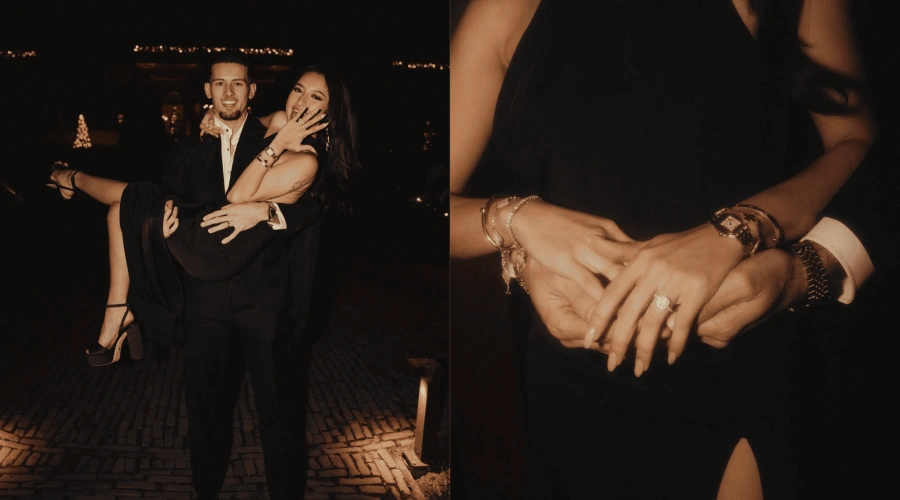 Dalam foto yang diunggah, terlihat Justin Hubner berlutut di hadapan Jennifer Coppen sambil memegang kotak cincin yang terbuka. Momen sakral tersebut dilakukan di luar ruangan dengan latar belakang bangunan megah bergaya Eropa pada malam hari, yang dihiasi lampu-lampu kekuningan yang menambah kesan hangat dan intim.
