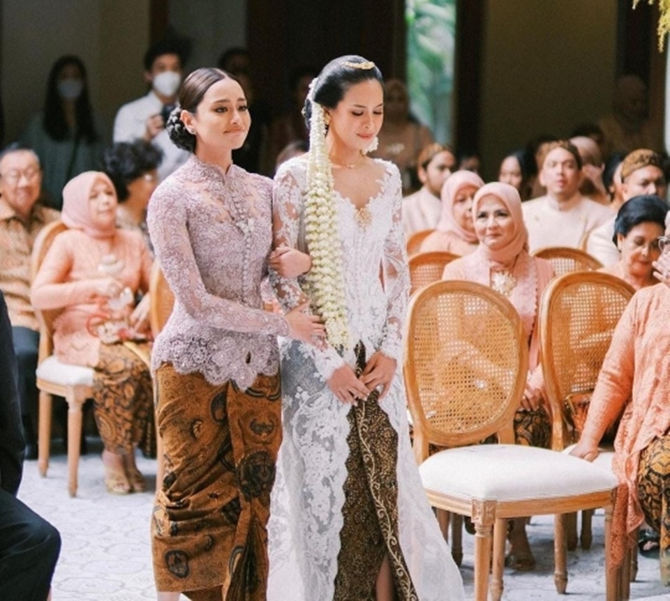 Amanda tampil cantik dalam balutan kebaya pengantin berwarna putih, sedangkan Maudy terlihat feminim dengan kebaya kuningnya.
