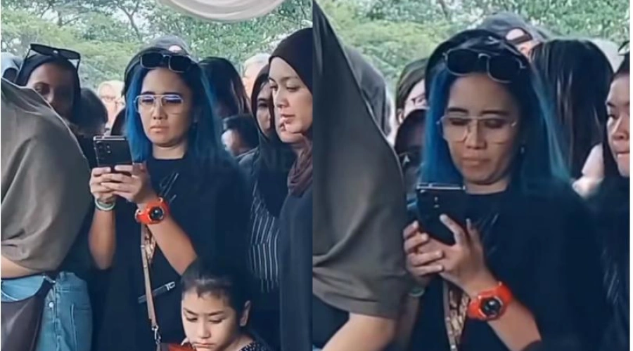 Di tengah suasana haru itu, seorang wanita berambut biru muncul dan langsung menjadi pusat perhatian. Wanita tersebut terlihat sangat emosional, menangis keras sekaligus sibuk merekam proses pemakaman dengan ponselnya.