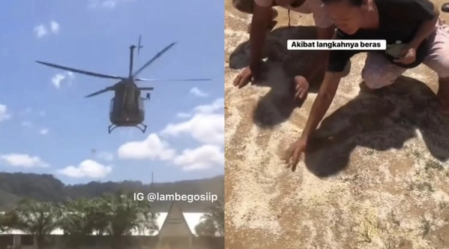 Video viral yang beredar di media sosial itu memperlihatkan bantuan yang berupa beras dan mie instan dilemparkan dari helikopter.
