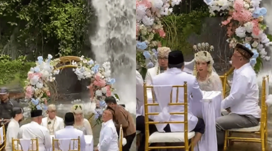 Dalam video yang beredar luas, terlihat jelas set meja akad nikah lengkap dengan kursi-kursi berwarna emas ditempatkan langsung di atas bebatuan sungai yang dialiri air jernih. Latar belakang air terjun yang menjulang tinggi menambah kesan dramatis dan natural pada momen sakral tersebut.